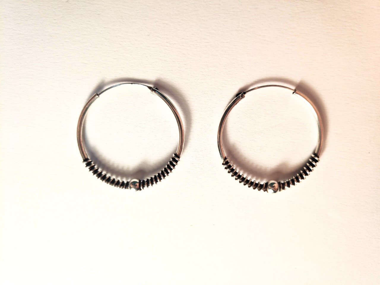 Aros de plata de ley de 35 mm, son finitos con una decoración tipo bali que consiste en una bola central y un hilo de plata entrelazado que resultan en una entramado de sombras muy hermoso. Unos pendientes de tamaño grandes mas bien, se pueden combinar con aros de tamaño mas pequeños o llevar solos. Su sensilles los hacen muy versatiles y faciles de llevar y combinar.