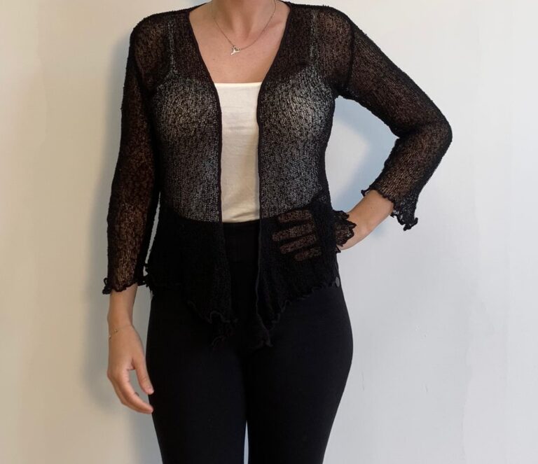 Nuestra chaqueta corta negra de crochet está hecho de material de rayón suave y transpirable. Es perfecta para cualquier ocasión es el accesorio perfecto el diseño frontal de lazo hace que esta chaqueta de punto transparente sea una capa rápida y fácil; perfecta y bonita cobertura para los brazos o vestidos de corte bajo. Mangas favorecedoras de tres cuartos y bordes con volantes naturales que acentúan la silueta femenina; se puede llevar atado alto, abajo o sin atar.