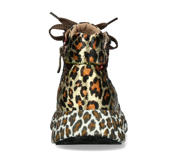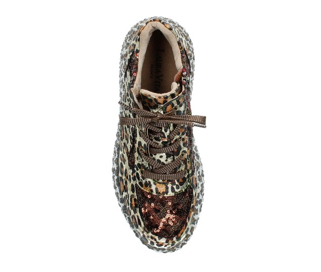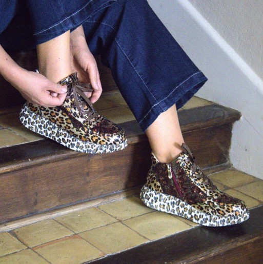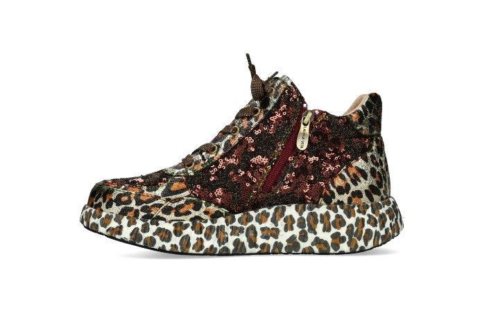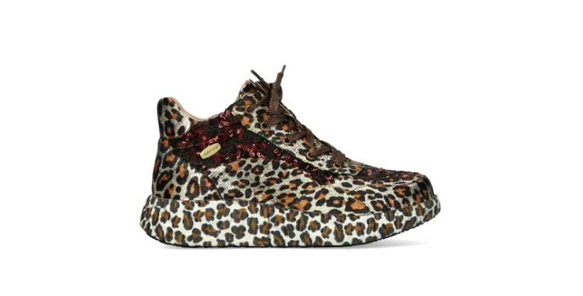Deportivos para mujer con diseño original que combina piel y lentejuelas en color marrón, con detalles multicolor y estampado animal.