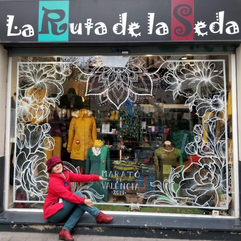 Inauguramos la tienda en Noviembre 2015 , le pusimos el nombre de La Ruta de la Seda por estar situado en el barrio de Velluters centro neurálgico de la manufacturación de la seda en Valencia durante el medievo. Valencia durante siglos fue un lugar muy importante en La Ruta de La Seda. Esta ruta entre Oriente y Occidente fue una vía comercial donde se intercambiaban productos , ideologías y religiones. La seda, producto muy apreciado por la nobleza, transitaba por esta ruta, China intentó guardar el monopolio de la seda a toda costa hasta que un día fueron dos monjes que arriesgando su vida pudieron sacar unos capullos de seda escondidos en sus bastones. Los llevaron primero al emperador bizantino donde empezaron a producir seda por primera vez fuera de China. Más tarde los árabes trajeron el gusano de seda a Valencia. El cultivo de las moreras era muy importante en la huerta valenciana y se transformó casi en un monocultivo en toda la región. El barrio de Velluters se transformó en un centro de manufacturación de la seda: 25000 personas llegaron a dedicarse al gremio de la seda en Valencia, con unos 5000 telares.