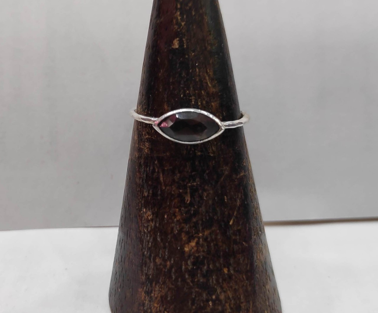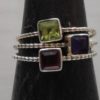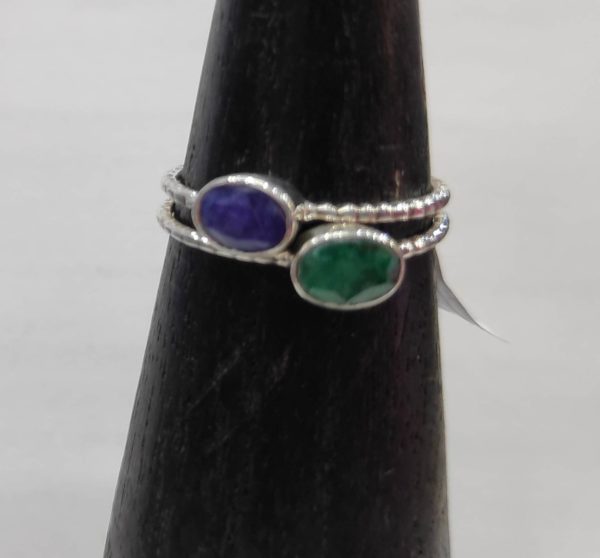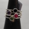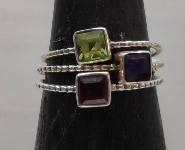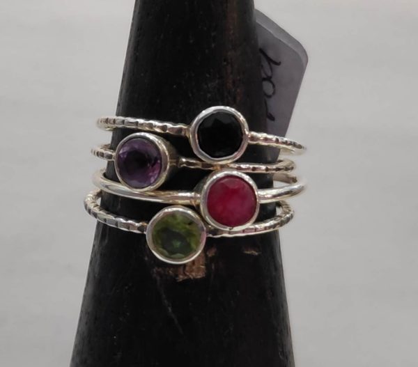 Anillo de plata montado con una pequeña piedra natural semi preciosas de ónix, amatista, malaquita, cuarzo, lapislázuli, rubí, topacio, peridoto, citrino. El anillo es de plata de ley, fino, puede ser liso o trenzado, la piedra lleva un trabajo de talla facetado que permite potenciar la belleza y el brillo de la piedra, puede ser de forma redonda ovalada o cuadrada. El anillo de plata, se puede llevar de manera individual o eligiendo varios anillos puedes hacerte un conjunto de 2, 3, 4 0 5 anillos variando las formas y los colores. De esa manera cada una puede hacerse un modelo único eligiendo sus piedras preferidas.