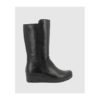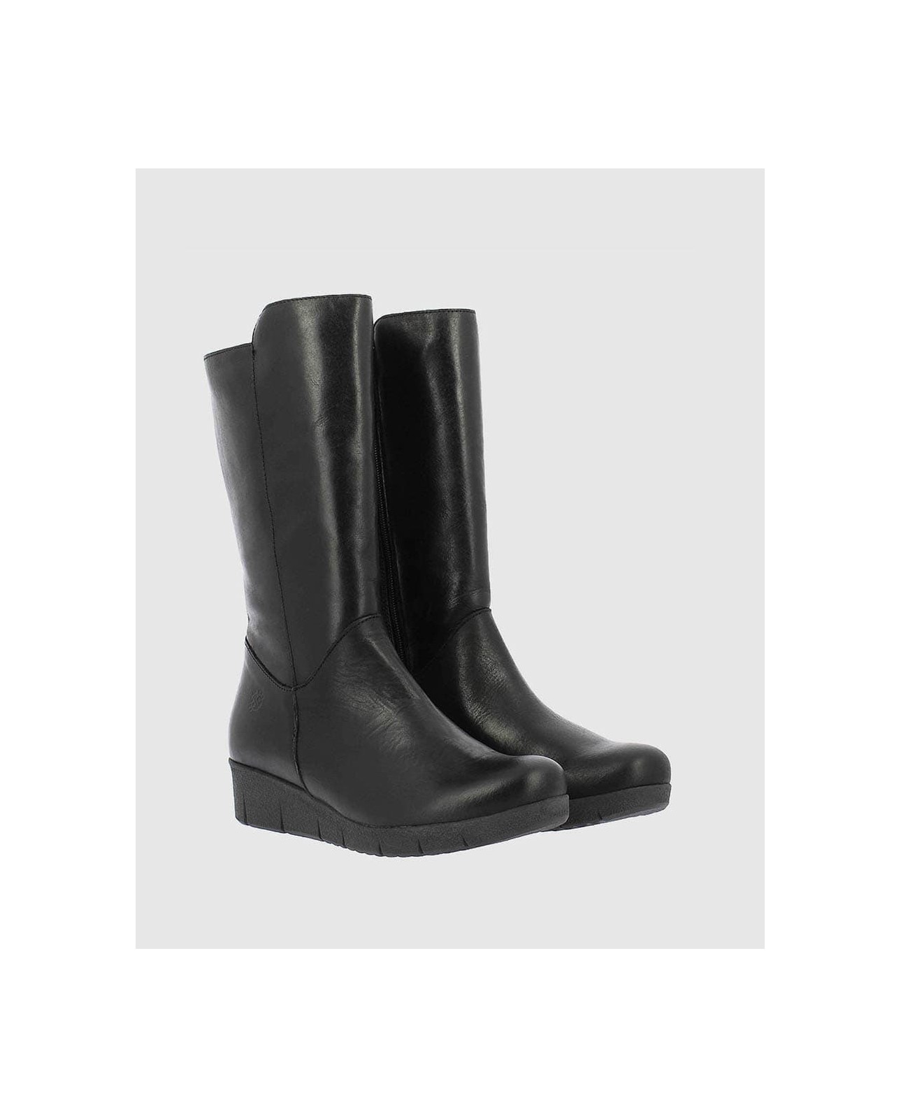 Bota de piel negra con cuña de 3,5 centímetros, altura de caña de 29 centímetros y anchura de caña de 15 centímetros. Fabricada en España con piel de ciervo, el cierre es de cremallera y la suela de goma. Su perfil de media caña se acoplara a tus mejores loock este invierno.