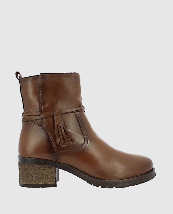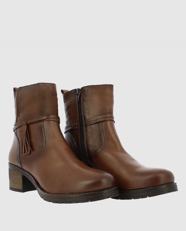 Nuestro botín de tacón de color cuero es uno de los modelos que elegimos para la campaña de invierno. Fabricado en España por Yokono, botín de tacón cuadrado de 5,5 cm, con detalle de borla lateral. Piel 100% con cierre de cremallera para tus looks más cómodos y ¡rock and roll!
