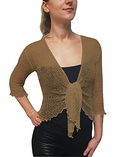 Nuestra chaqueta corta croché brown está hecho de material de rayón suave y transpirable. Es perfecta para cualquier ocasión es el accesorio perfecto el diseño frontal de lazo hace que esta chaqueta de punto transparente sea una capa rápida y fácil; perfecta y bonita cobertura para los brazos o vestidos de corte bajo. Mangas favorecedoras de tres cuartos y bordes con volantes naturales que acentúan la silueta femenina; se puede llevar atado alto, abajo o sin atar.