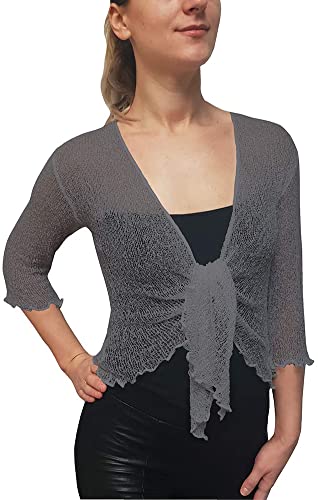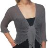 Nuestra chaqueta gris oscuro está hecho de material de rayón suave y transpirable. Es perfecta para cualquier ocasión es el accesorio perfecto el diseño frontal de lazo hace que esta chaqueta de punto transparente sea una capa rápida y fácil; perfecta y bonita cobertura para los brazos o vestidos de corte bajo. Mangas favorecedoras de tres cuartos y bordes con volantes naturales que acentúan la silueta femenina; se puede llevar atado alto, abajo o sin atar.