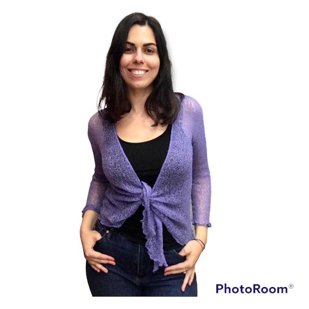 Nuestra chaqueta violeta de ganchillo está hecho de material de rayón suave y transpirable. Es perfecta para cualquier ocasión, el diseño frontal de lazo hace que esta chaqueta de punto transparente sea rápida y fácil de poner; una perfecta y bonita cobertura para los brazos. Tiene una mangas favorecedoras de tres cuartos y bordes con volantes naturales que acentúan la silueta femenina; se puede llevar atado alto, abajo o sin atar.