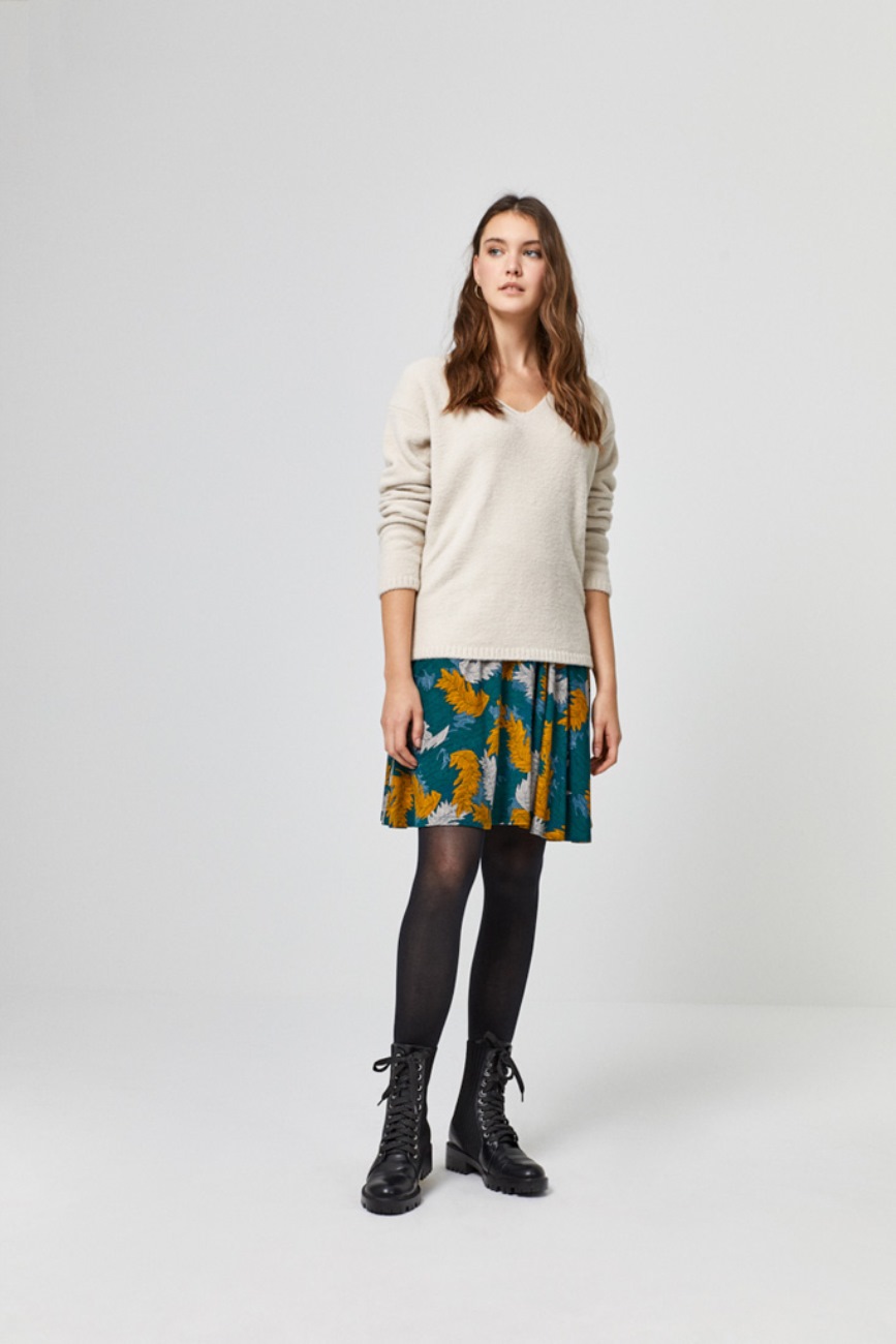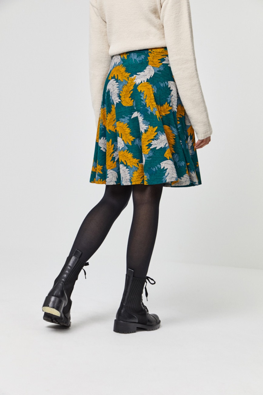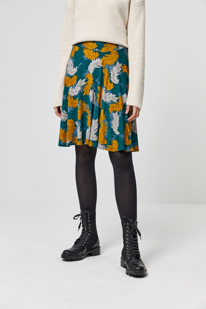 Falda midi con vuelo de punto de color verde con un estampado de hojas color mostaza y gris. Modelo de talle alto con cintura elástica.