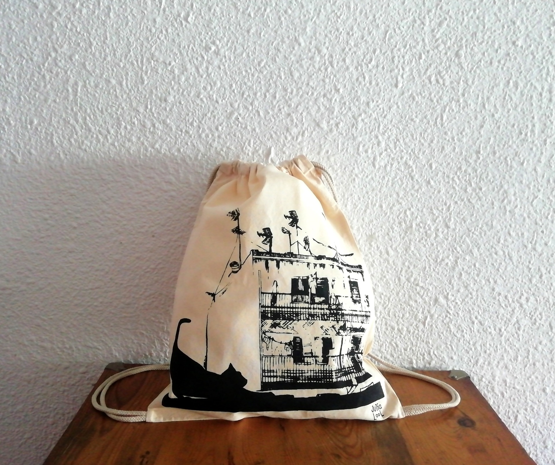 Mochila Barrio del Carmen, serigrafiado a mano, el barrio del Carmen un icono que siempre acompaña a la autora Julia LOOL, una artista Valenciana.