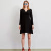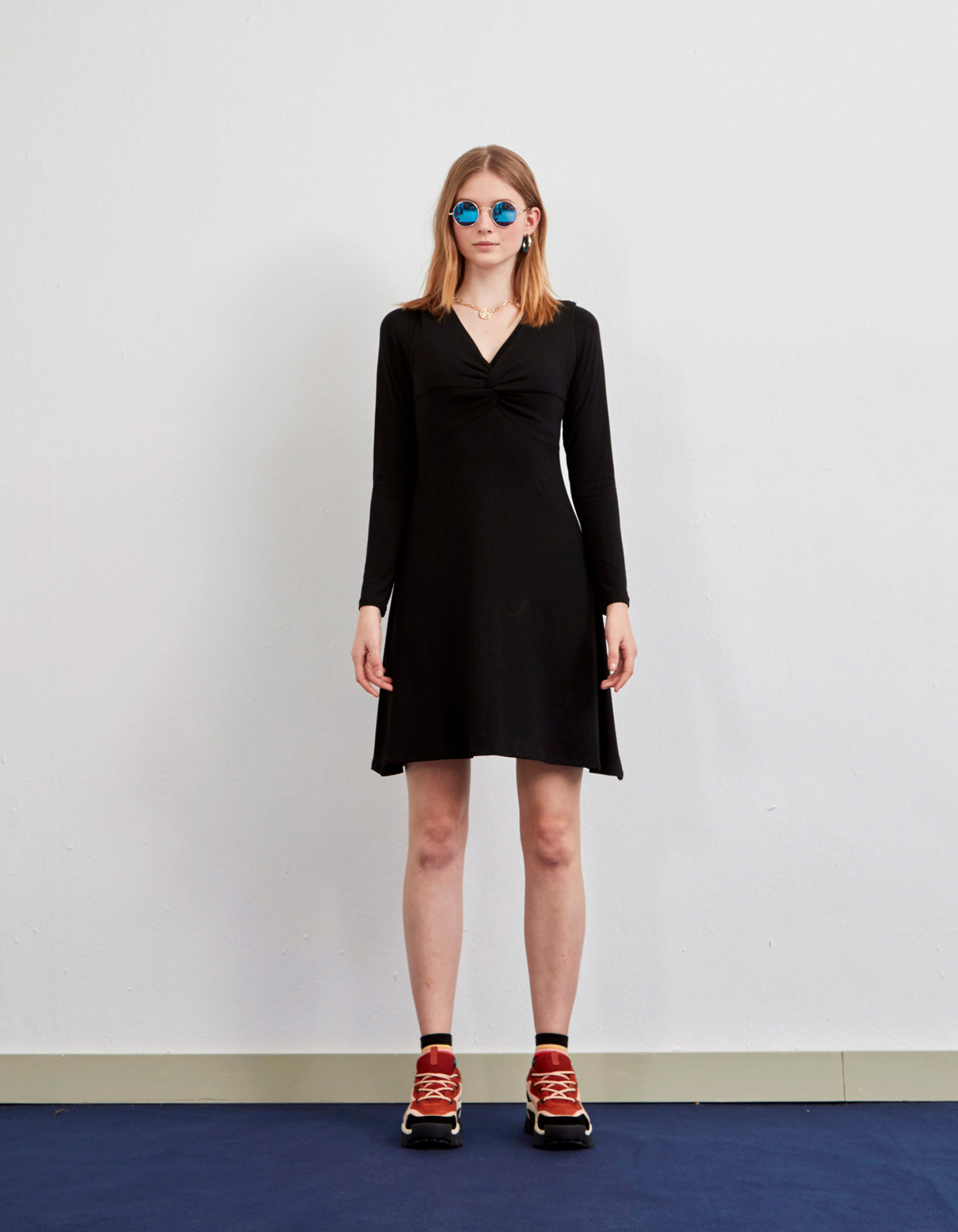 Vestido liso negro escote pico con nudo y manga larga. Llévalo de día con botas y de noche con unos botines de tacón.