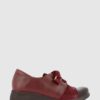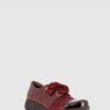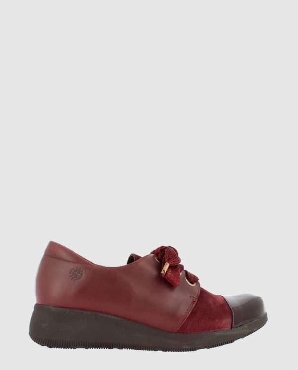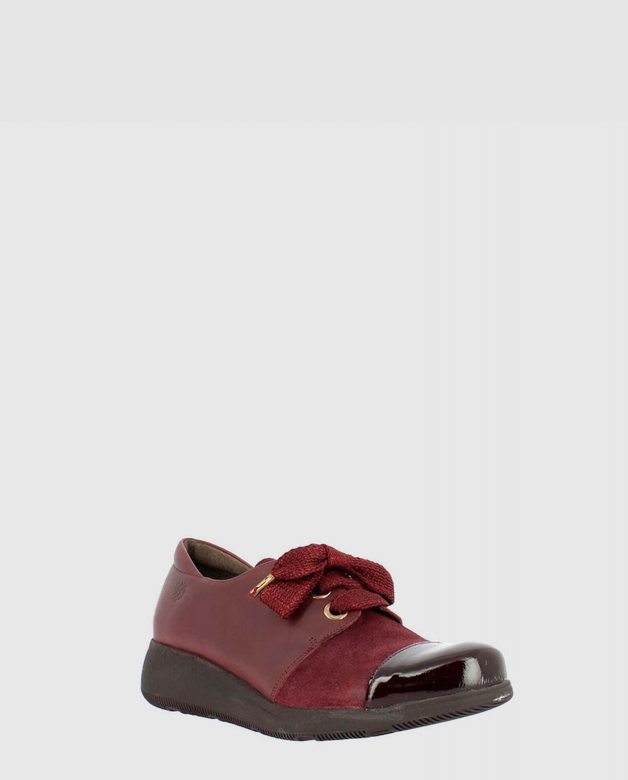 Zapato de piel plano fabricado en España por Yokono en color burdeo. Su suela de goma hace más agradable cada paso, su acabado en tres pieles diferentes lo hace único, elegante y original.